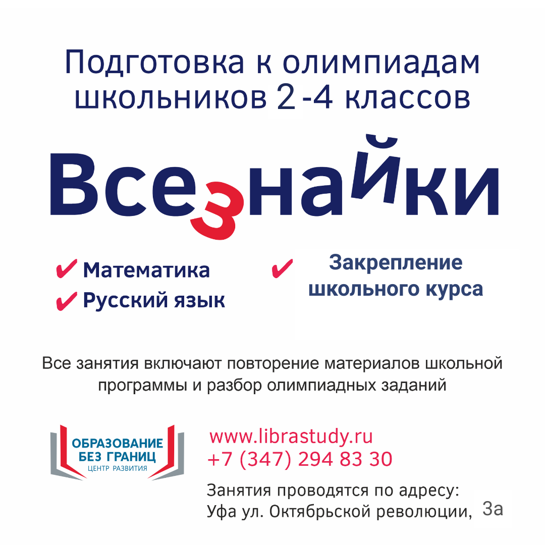 Программа "Всезнайки" направлена на олимпиадную подготовку школьников по математике, логике, русскому языку. Занятие по математике и русскому языку - 90 минут / 1 раз в неделю ( перерыв 10 минут) На уроках математики ребята занимаются устным счётом, решением олимпиадных задач и задач из школьной программы повышенной сложности, решают головоломки и играют. Обязательный навык - записывать и оформлять решения задач. На уроках русского языка ребята изучают основы лингвистической логики. Программа выходит за рамки школьных уроков русского языка раскрывает секреты подготовки к олимпиадам и конкурсам. На каждом занятии изучается одна-две темы, решаются задачи на лингвистическую логику, разбираются олимпиадные задания. Ребятам понравятся ребусы, шарады, головоломки. Занятия проходят по системе развивающего обучения в формате тренировки. На занятиях преподаватели выдают задания для самостоятельной работы, которые рекомендованы для достижения высоких результатов. В конце каждого модуля проводится мини турнир по математике и русскому языку для закрепления освоенного материала